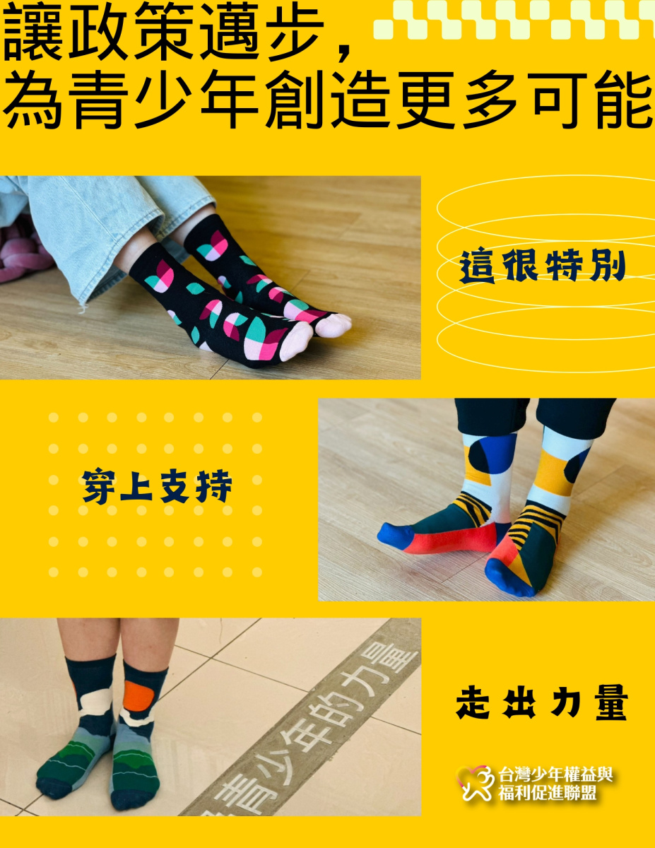 這不只是一雙襪子,更是您對台灣青少年權益的實質參與。您的支持將轉化為監督政策與修法的動能,讓「讓政策成為青少年的力量」不再只是口號,而是能陪伴兒少走得更遠、更穩的具體行動。