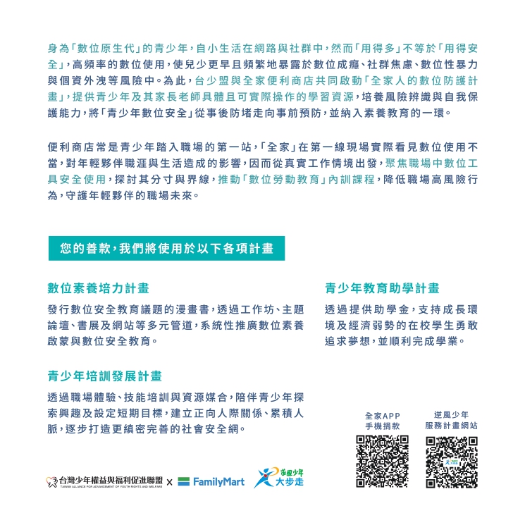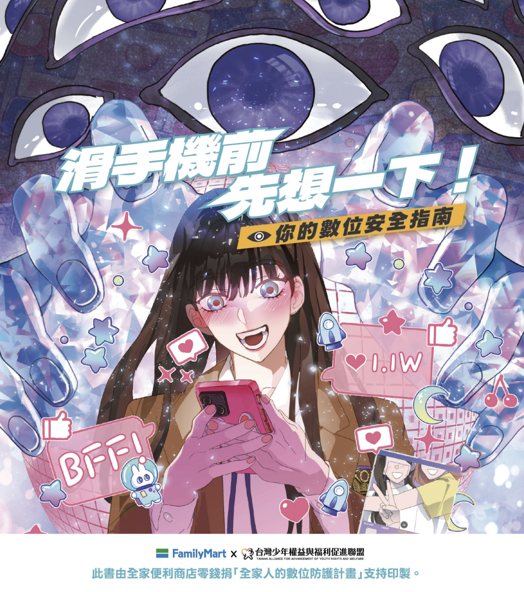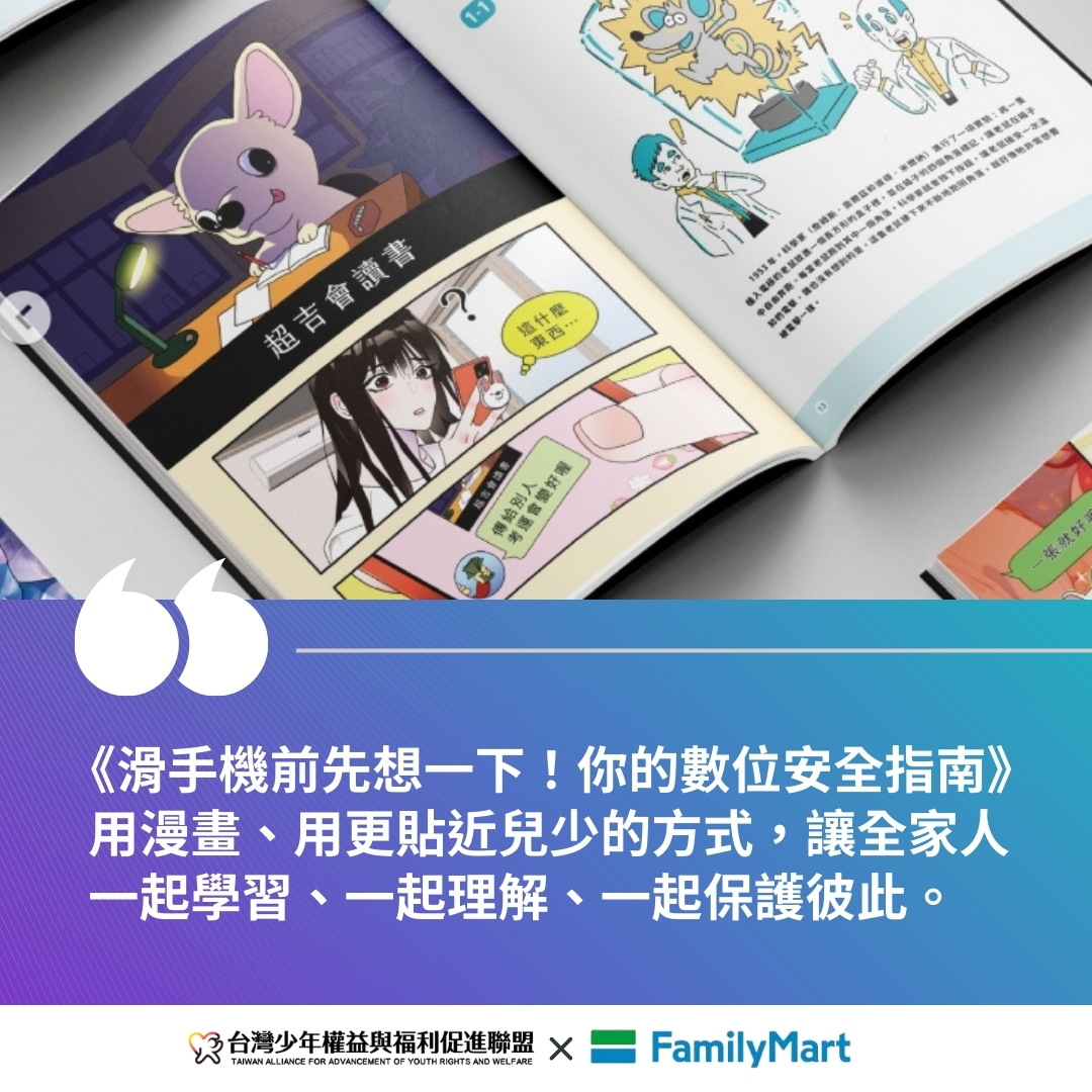 隨著科技的進步,現今青少年在充滿數位產品的環境中成長,但「高頻率使用」不等於「高品質素養」,青少年享受科技發展帶來便利,卻也必須提早面對數位成癮、社群焦慮、數位性暴力與個資外洩等多重風險。台少盟與全家便利商店延續「逆風少年大步走」公益計劃17年來關心青少年議題的主軸,於 2026 年啟動「全家人的數位防護計畫」,透過發行漫畫《滑手機前先想一下!你的數位安全指南》提供青少年具體且可實際操作的數位素養學習資源,亦讓父母、老師及青少年工作者在教學上,擁有更靈活運用的素材。