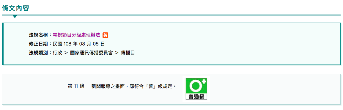 新聞報導之畫面,應符合「普」級規定。圖:全國法律資料庫截圖(Public Domain)