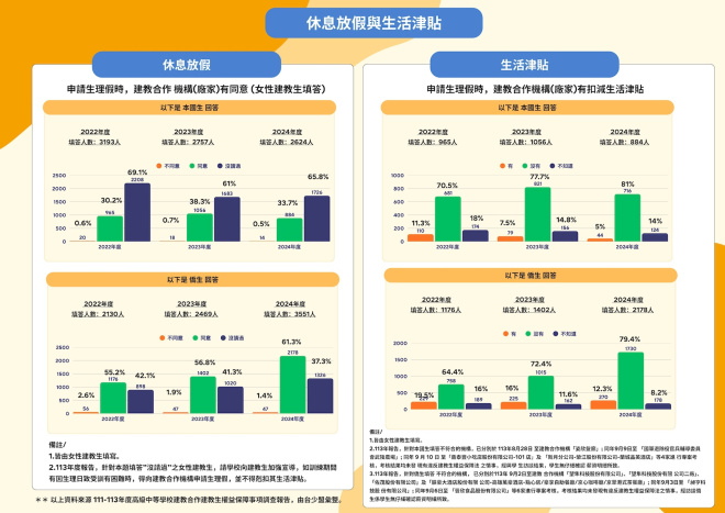 其中以「申請生理假被扣生活津貼」為例,儘管法條明文禁止:2022年仍有11.3%本國生填答「有被扣」;2023年為7.5%;2024年仍達5%,可見即便《建教生權益保障法》已新增明確規範,從建教生的反映看來卻仍未完全落實。而更值得注意的是,該題2022年填答「不知道」人數174人,佔 18%;2023 年填答「不知道」人數156人,佔14.8%;2024年填答「不知道」人數 124 人,佔 14%。仍有約14%學生回答「不知道」,顯示教育與宣導不足。台少盟指出,教育部雖曾針對部分機構進行專案考核與訪談,但從「建教生權益保障事項調查」報告中對於調查方式、範圍與結果卻說明不清,無法釐清問題根源。