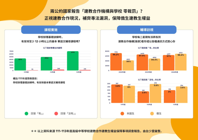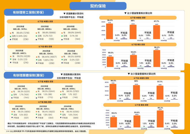 台少盟表示,如據教育部2022至2024年「建教生權益保障事項調查」報告進行檢視,以「有辦理勞工保險(勞保)」此題為例,2022年僑生回答「沒有」23人,佔0.5%;2023年答「沒有」78人,佔1.5%;2024年答「沒有」32人,佔0.4%,而回答「不知道」的僑生人數及佔比分別為2022年216人,佔4.8%;2023年258人,佔4.9%;2024年238人,佔3.3%,皆明顯高於本國生,顯示教育主管機關及學校未全面落實僑生建教生權益保障。