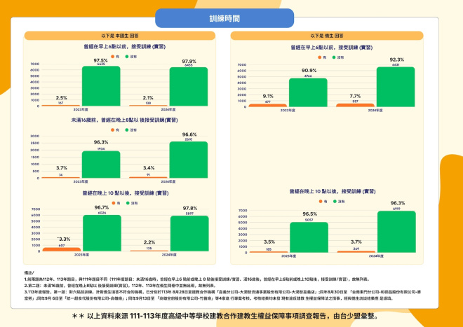 (圖)本國生或者僑生,都有約2%學生反映有超時訓練的狀況出現,而僑生的狀況又通常高於本國生,特別是僑生早上6點前接受訓練有557人,佔7.7%,明顯高於本國生的2.1%、超過12小時有793人,佔11%,明顯高於本國生的2.3%,如果單純以「誤填」作為說明,恐怕難以讓人信服。