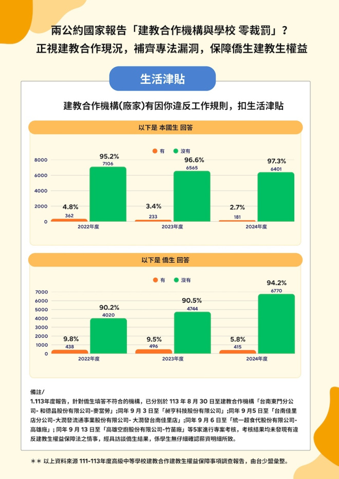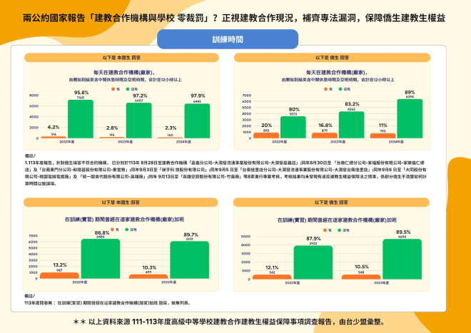 據行政院兩公約第四次國家報告中,第272點寫明「……2020年至2024年總計考核223家;上開定期考核期間,並無建教合作機構及學校違反規定遭裁罰。」然據立法院預算中心之報告,2017至2021年度,建教生申訴案件中就有29件被認定違法並依法裁罰,其中2020、2021兩年亦達6件。為釐清建教合作現場學生權益落實情形,台少盟根據教育部2022至2024年「建教生權益保障事項調查」進行比對,卻發現其中許多項目早已呈現出勞動保護規定未被落實的情形。
