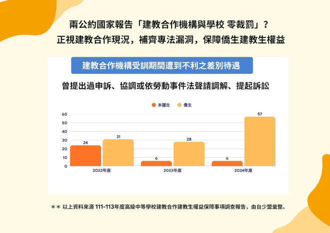 然僑務委員會自2014年起辦理「3+4產學攜手合作僑生專班」(下稱3+4僑生專班)以來,該專班僑生人數逐年攀升,從2014年新生281人,至2024年已達5,723人。教育部2024年「建教生權益保障事項調查」中,受調查僑生人數更高達7,718人,為首次超越本國生。台少盟與與勞陣、全教總、林凱衡博士指出,隨著僑生建教生人數已超越本國生,相關權益保障卻未與時俱進,教育部應正視此趨勢,除立即修正國家報告的錯誤數據,並儘速啟動《高級中等學校建教合作實施及建教生權益保障法》(下稱建教生權益保障法)修法,將僑生權益明確納入專法保障。