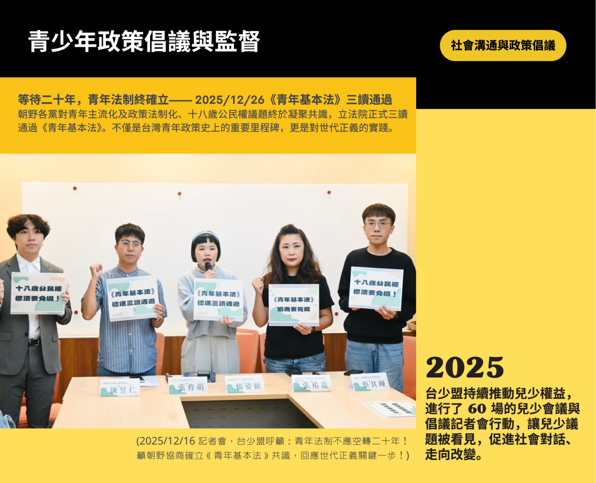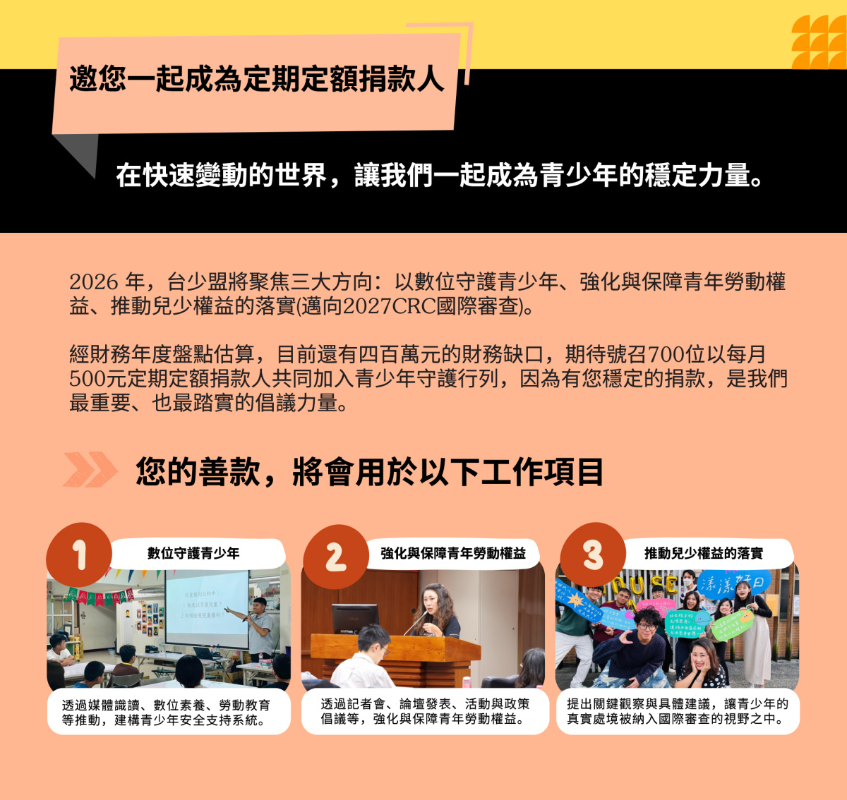 2026 年,台少盟將持續聚焦青年勞動權益與教育體系之間的斷裂問題,推動勞動權益教育向下扎根,並透過研究、政策倡議與現場經驗,促使制度正視青少年與青年在勞動市場中的結構性弱勢。我們期待,成長不必以受傷為代價,學習與工作之間,不應是權益被犧牲的空白地帶。