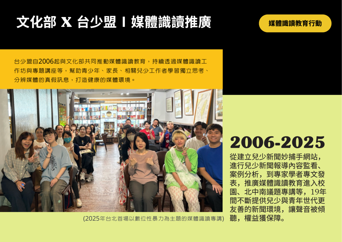 台少盟將持續從青少年權益的角度出發,回應數位環境對兒少生活帶來的影響與衝擊,並推動包含數位安全、媒體識讀、隱私保障與心理支持等面向的制度檢視與政策倡議。讓青少年在真實世界與數位世界中,都能被理解、被保護,也能被信任為有判斷能力的主體。