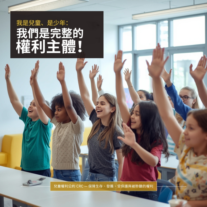 CRC 是全球最具共識的人權公約,它打破了過去「囝仔人有耳無嘴」的舊觀念,確認了 18 歲以下的兒童與少年就是完整的「權利主體」。它保障了孩子們的生存權、發展權、受保護權,以及非常重要的「被聆聽權」——也就是說,當大人們在制定會影響到兒少的法律或政策時,必須把「兒童的最佳利益」放在首位,並且認真傾聽他們的聲音。